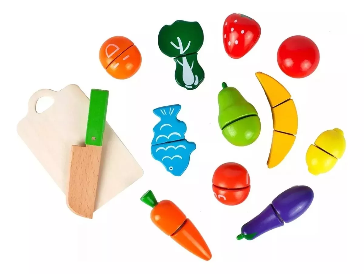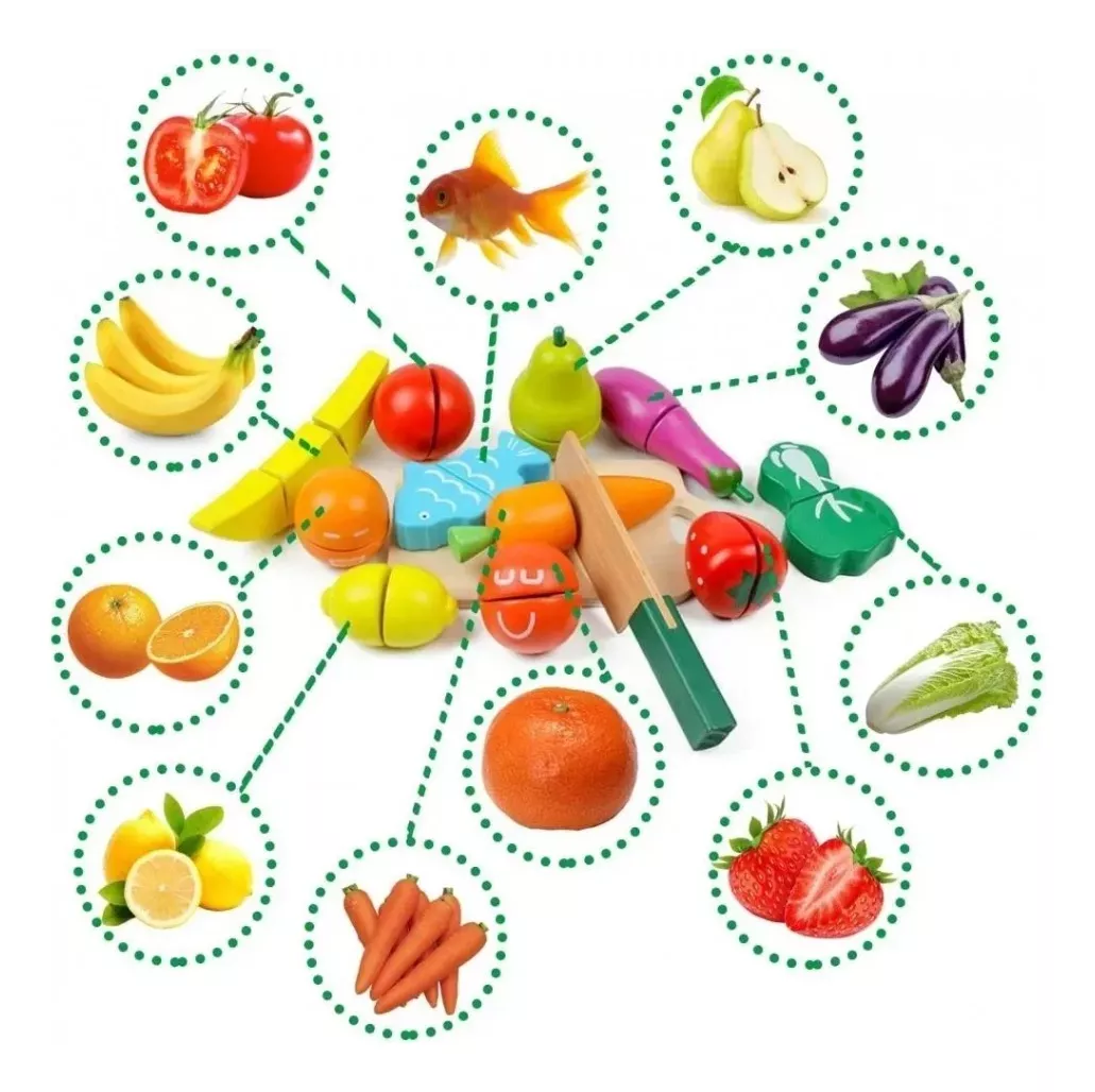 Balde con Frutas y Verduras para Cortar – Juguete de Madera Montessori