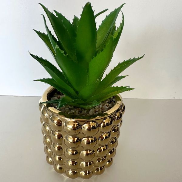 Añade un toque de elegancia y frescura a tus espacios con esta mata artificial en macetero decorativo dorado, evocando la forma de una piña. Su diseño combina belleza y practicidad, aportando un detalle sofisticado que ilumina y armoniza cualquier rincón de tu hogar u oficina.