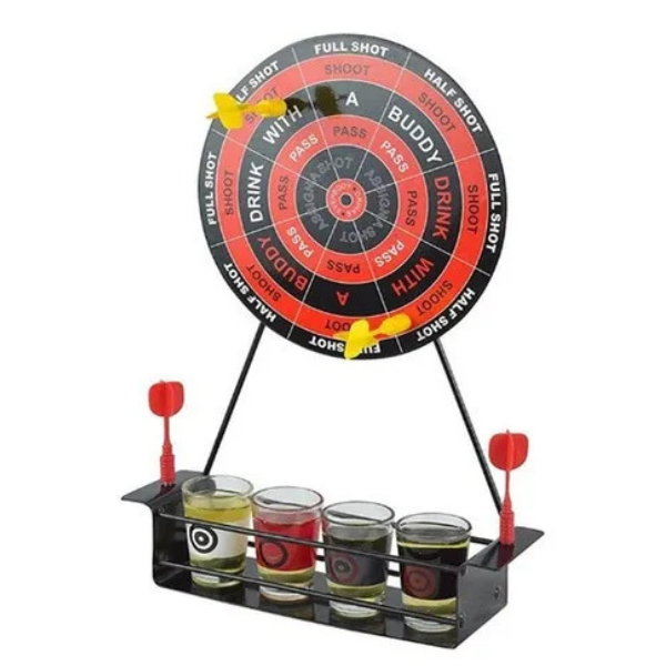Juego de dardos magnéticos con vasos tipo shot. Diseñado para adultos, ideal para fiestas donde se quiera combinar risas, desafíos y un toque competitivo.